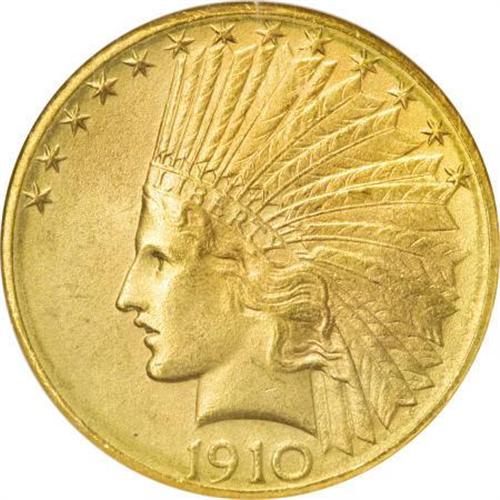 <B>1910-D $10 MS65 NGC.</B></I> This piece has rich, satiny olive-gold surfaces with impressive design definition on the high points and just a few shallow, in consequential abrasions. While this issue is easily the most common branch mint Indian eagle, it is highly desirable in Gem and finer grades. NGC has only certified 51 finer examples (11/07). <BR><BR><B>Coin Engraver:</B> Augustus Saint-Gaudens<BR><BR><b>Shipping:</b> Coins & Currency (<a target="_blank" href="http://www.heritageauctions.com/common/shipping.php">view shipping information</a>)