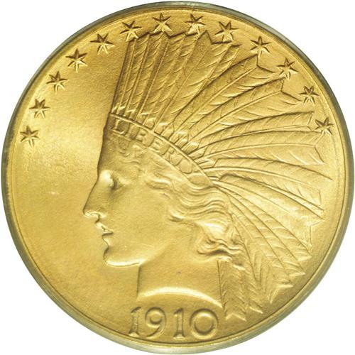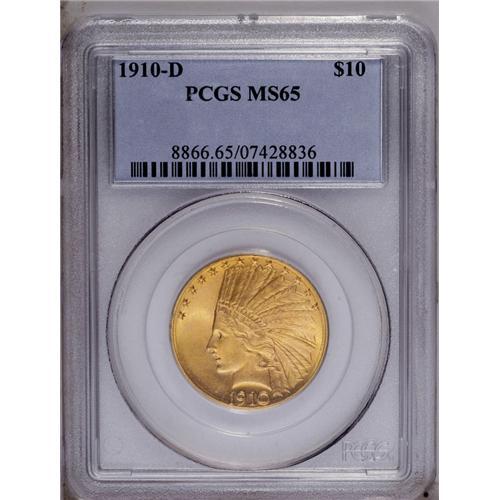 <B>1910-D<$10> MS65 PCGS.</B></I> An uncommonly attractive example of this early Denver issue, not only because of the superior luster characteristics seen on the coin, but also because of the enchanting mixture of coppery-golden patina. Sharply struck, the surfaces are exceptionally clean for an Indian eagle, with no obvious or mentionable marks. True Gem quality. Population: 56 in 65, 25 finer (2/06).