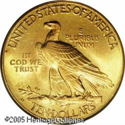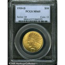 <B>1910-D $10 MS65 PCGS.</B></I> Satiny luster throughout and very well preserved for an Indian eagle. The surfaces are a delight to study, with virtually no signs of contact aside from a couple of minute ticks, one near Liberty's temple and another on the eagle's neck. Fully struck as are most of this issue, with ample luster to please the eye. Hard to find this nice, and very difficult to locate better. Population: 52 in 65, 24 finer (1/05). Lot:8862