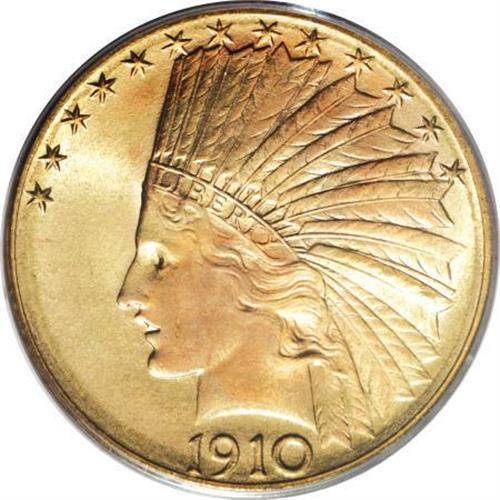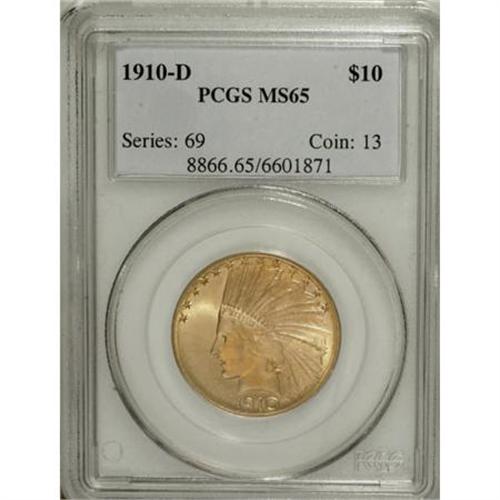 <B>1910-D $10 MS65 PCGS.</B></I> The 1910-D is plentiful in typical Mint State grades, but emerges as a conditional rarity at the MS65 level, perhaps ten times scarcer than the "type" 1932. This lustrous example is mostly olive-gold, although blushes of deeper orange are prominent on the cheek, neck, and DOLLARS. Population: 65 in 65, 25 finer (11/07).<BR><I>From The Parker Lee III Collection.</B></I><BR><BR><B>Coin Engraver:</B> Augustus Saint-Gaudens<BR><BR><b>Shipping:</b> Coins & Currency (<a target="_blank" href="http://www.heritageauctions.com/common/shipping.php">view shipping information</a>)