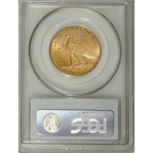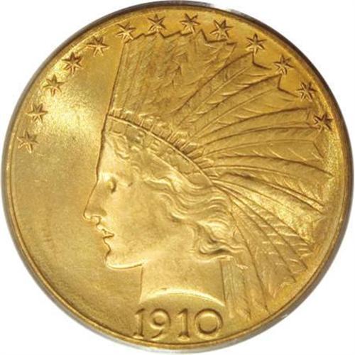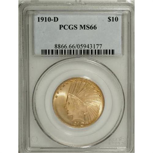 <B>1910-D $10 MS66 PCGS.</B></I> Even though huge numbers of the 2,356,640-piece 1910-D eagle mintage were melted during the 1930s, sufficient numbers survived overseas to meet present-day collector demand. If the PCGS/NGC population figures are any indication, a fairly large number exist through MS64. The numbers drop off significantly in MS65, and Premium Gem pieces become challenging. Higher-grade coins are elusive.<BR> Beautiful apricot-gold and mint-green coloration rests on highly lustrous surfaces that display a pleasing fine-grained finish. Strong definition is the rule on the design elements, including those along the peripheries, areas that are often weak on the issue. Jeff Garrett and Ron Guth (2006) suggest that this weakness may have been caused by the collar, which held the coin in place during striking, or by die wear. There is a faint inner border on both sides, possibly associated with this situation, but as mentioned, the peripheral devices are sharp. There are no mentionable marks to report. Population: 25 in 66, 0 finer (7/07).<BR><BR><B>Coin Engraver:</B> Augustus Saint-Gaudens<BR><BR><b>Shipping:</b> Coins & Currency (<a target="_blank" href="http://www.heritageauctions.com/common/shipping.php">view shipping information</a>\)