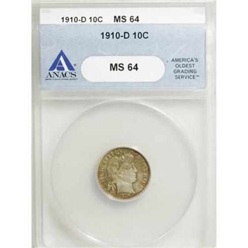 <B>1910-D 10C MS64 ANACS.</B></I> NGC Census: (26/7). PCGS Population (18/17). Mintage: 3,490,000. Numismedia Wsl. Price for NGC/PCGS coin in MS64: $650. (#4855)<BR><BR><B>Coin Engraver:</B> Charles E. Barber<BR><BR><b>Shipping:</b> Coins & Currency (<a target="_blank" href="http://www.heritageauctions.com/common/shipping.php">view shipping information</a>)