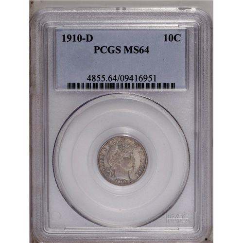 <B>1910-D<10C> MS64 PCGS.</B></I> Moderately toned with some mottled turquoise-blue and reddish-gold patina intermixed on each side. A sharp near-Gem specimen.