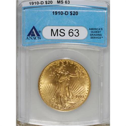 <B>1910-D $20 MS63 ANACS.</B></I> A lovely prewar Saint-Gaudens twenty with comprehensive luster and a precise strike. The obverse is uncommonly clean for the grade, as is the reverse despite a single thin mark beneath DOLLARS.<BR><BR><b>Shipping:</b> Coins & Currency (<a target="_blank" href="http://www.heritageauctions.com/common/shipping.php">view shipping information</a>)