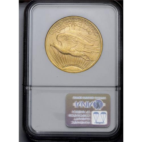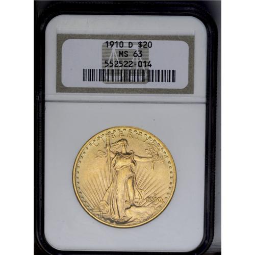 <B>1910-D<$20> MS63 NGC.</B></I> Exuberant green-gold luster sweeps across this moderately abraded and reasonably struck Saint-Gaudens twenty. The Denver Mint struck five times more eagles than double eagles in 1910, which suggests that eagles had greater demand in local circulation.