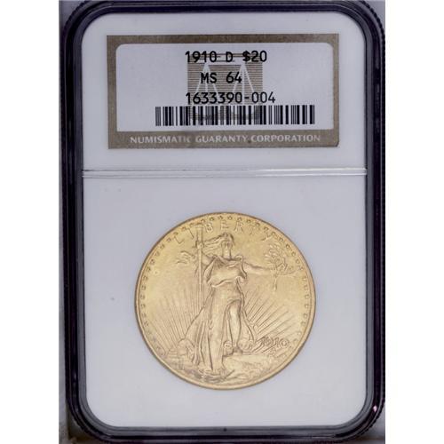 <B>1910-D $20 MS64 NGC.</B></I> A minutely detailed example of this issue, with appealing honey-gold color. The surfaces are somewhat granular, as sometimes seen on this issue, and exhibit soft luster. Examination with a loupe reveals a few grade-limiting ticks on each leg and in the right obverse field nearby, on this nonetheless highly appealing coin.