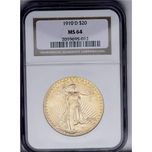 1910-D $20 MS64 NGC. Satiny luster, attractive yellow- 1910-D[$20] MS64 NGC.