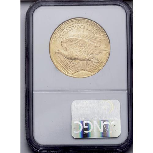 <B>1910-D<$20> MS64 NGC.</B></I> Satiny luster, attractive yellow-orange surfaces, and a modicum of light, grade-consistent abrasions characterize this pretty near-Gem example. This is the last year of the Wide D mintmark, to be substituted in 1911 and later years by a Narrow D.