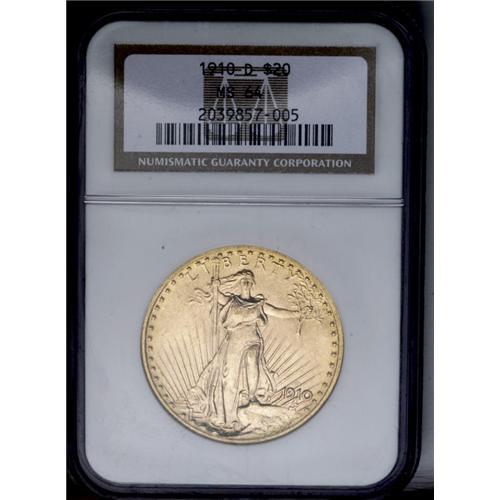 <B>1910-D<$20> MS64 NGC.</B></I> The orange-yellow surfaces show surprisingly few marks for the grade. A boldly struck example with rather frosty luster and just a touch of weakness on Liberty's knee.