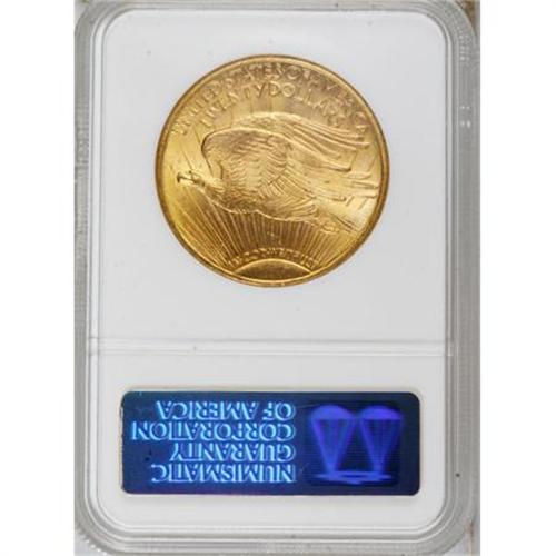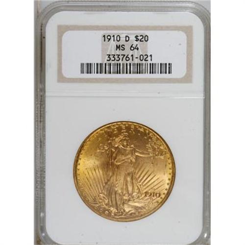 <B>1910-D $20 MS64 NGC.</B></I> This evenly struck and thoroughly lustrous near-Gem has orange and green-gold toning. Each side has only a single remotely noticeable mark. Encased in a prior generation holder.<BR><BR><B>Coin Engraver:</B> Augustus Saint-Gaudens<BR><BR><b>Shipping:</b> Coins & Currency (<a target="_blank" href="http://www.heritageauctions.com/common/shipping.php">view shipping information</a>)