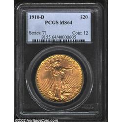 1910-D $20 MS64 PCGS. A lustrous near-Gem with a bold strike. The eagle has a small contact mark in the center of the wing, but the impressively near-pristine fields provide excellent eye appeal. Important notice: We expect to be auctioning lots at the rate of 200-250 per hour. Sometimes eBay Premier live bid software cannot keep up with that pace, so we strongly recommend that you place a realistic proxy bid now as insurance to avoid disappointment. Also please note that all Heritage/CAA lots purchased through eBay Premier carry a 20% Buyer's Premium. Please make sure you read the Terms and Conditions.