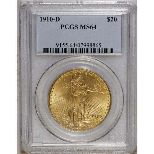 <B>1910-D<$20> MS64 PCGS.</B></I> Hints of salmon appear on the highly lustrous surfaces. The well struck devices are clean, and the yellow-orange fields have just a few too many marks for a higher grade.