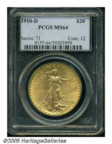 <B>1910-D<$20> MS64 PCGS.</B></I> The 1910-D is a common date in any condition short of MS65. The honey-gold Near Gem presented here has nice luster, and exhibits sharply struck design elements. Except for a couple of minute abrasions on the knee of Liberty's left leg, and some minor marks on the eagle's left wing, the surfaces are relatively well preserved.