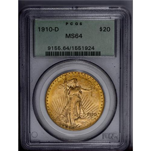 <B>1910-D $20  MS64 PCGS.</B></I> Vibrant luster and rich peach toning provide pleasing eye appeal. This older holder near-Gem has a good strike and no obtrusive marks.