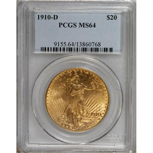 <B>1910-D $20 MS64 PCGS.</B></I> PCGS Population (1355/743). NGC Census: (1480/389). Mintage: 429,000. Numismedia Wsl. Price for NGC/PCGS coin in MS64: $1,035. (#9155)<BR><BR><B>Coin Engraver:</B> Augustus Saint-Gaudens<BR><BR><b>Shipping:</b> Coins & Currency (<a target="_blank" href="http://www.heritageauctions.com/common/shipping.php">view shipping information</a>\)
