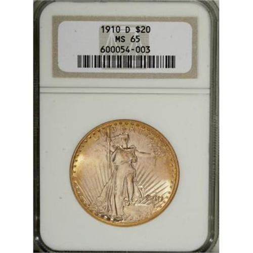 <B>1910-D $20 MS65 NGC.</B></I> A shining Gem with pale straw-gold centers that cede to deeper sun-gold at the margins. Crisp definition and pleasing surface quality, a solid coin in every respect.<BR><BR><B>Coin Engraver:</B> Augustus Saint-Gaudens<BR><BR><b>Shipping:</b> Coins & Currency (<a target="_blank" href="http://www.heritageauctions.com/common/shipping.php">view shipping information</a>)