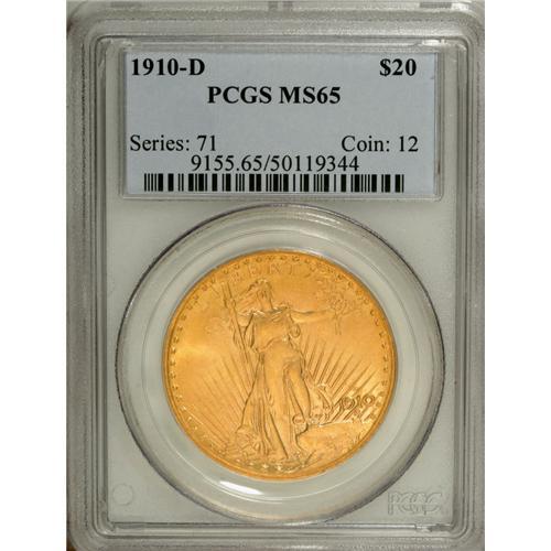 <B>1910-D $20 MS65 PCGS.</B></I> A gorgeous example that remains relatively available in Gem MS65 grade, but quite rare any finer. This piece has satiny yellow-gold luster with sharp design features and few grade-consistent marks. Although some type collectors may gravitate to the most common dates of the 1920s, astute buyers prefer pieces that are substantially scarcer for only a modest premium, such as this 1910-D issue.<BR><BR><b>Shipping:</b> Coin/Currency (<a target="_blank" href="http://www.heritageauctions.com/common/shipping.php">view shipping information</a>)