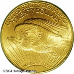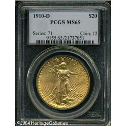 1910-D $20 MS65 PCGS. A moderately available Denve <B>1910-D $20 MS65 PCGS.</B></I> A moderately available Denver issue in lower grades with Gems occasionally available. This is a sharp example that has thick, satiny mint luster and light reddish-golden coloration. Fully struck. <BR><BR><B>Important notice:</B> Heritage usually auctions material at the rate of 200-250 lots per hour. On some occasions eBay Live bid software or the Internet may not be able to keep up with the pace of the auction. We recommend placing a realistic absentee bid now as insurance to avoid disappointment. Occasionally the auctioneer may eliminate or reject an eBay Live bid, and the auctioneer may also reopen a lot after the close of the eBay live bidding (usually because we missed an audience bid), and may reject your bid even if it shows you as the winning bidder. By bidding via eBay Live, you agree that Heritage may award the lot to another bidder at its sole discretion under the circumstances described above or any other reasonable circumstances. Since eBay bids are not shown to us until we open the lot on the floor, we treat those bids just like floor bids. In most cases the floor responds before the eBay bid is presented to us, due to Internet lag time, so for consistency we have made it a policy that floor bids are always considered first over tie eBay live bids. Also please note that all Heritage lots purchased through eBay Live carry a 20% Buyer's Premium. Please make sure you read the Terms and Conditions before you bid. This lot is being auctioned in conjunction with a live floor auction by Heritage Galleries & Auctioneers. All final auction and invoice information will be supplied by Heritage Galleries & Auctioneers, and all other information should be considered preliminary. Lot:7112