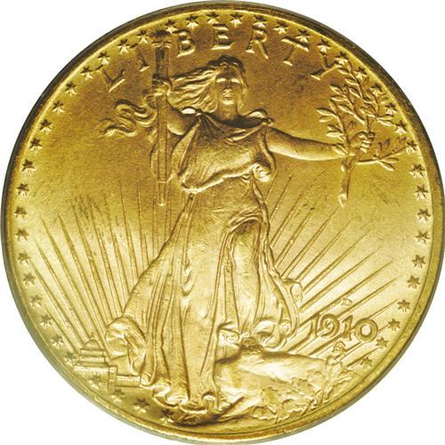 <B>1910-D<$20> MS65 PCGS.</B></I> A sharply defined Gem Mint State example with frosty yellow luster and traces of orange color. Pleasing surfaces with only minor abrasions as expected at this grade level. Hardly a rare date, despite a limited mintage of 429,000 coins, and yet relatively few finer examples have been certified. In fact, PCGS has only graded 78 better coins, quite a limited population compared to the number of submissions throughout the series.