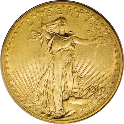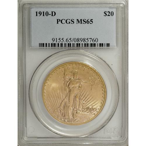 <B>1910-D $20 MS65 PCGS.</B></I> A slightly hazy Gem example that has lustrous yellow-gold fields with a touch of honey. Well-defined overall and highly appealing. Though the 1910-D has a lower mintage than its Philadelphia counterpart, the former is slightly more available in this grade.<BR><BR><b>Shipping:</b> Coins & Currency (<a target="_blank" href="http://www.heritageauctions.com/common/shipping.php">view shipping information</a>)