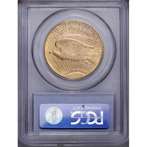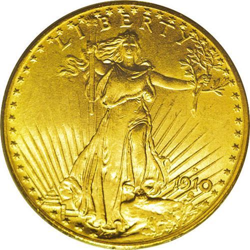 <B>1910-D<$20> MS65 PCGS.</B></I> The 1910-D is plentiful through MS63 and MS64, and even full Gems are not all that difficult. This pleasant MS65 specimen yields a brass-like appearance with radiant luster and a finely-grained matte-like texture. Excellent definition is apparent on the design elements. Minute marks on Liberty's lower left (right facing) leg and the reverse rim are mentioned for accuracy.