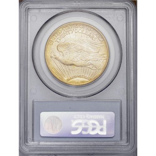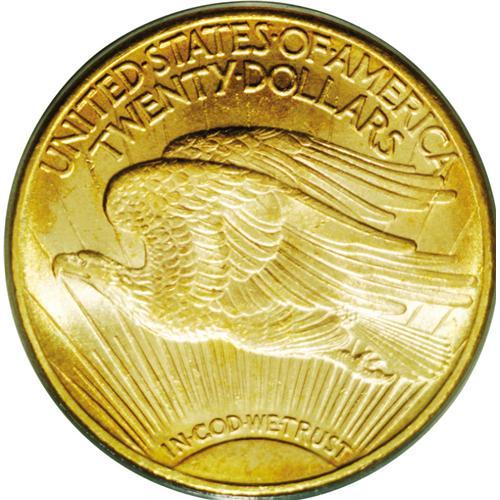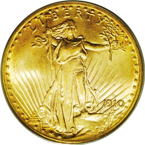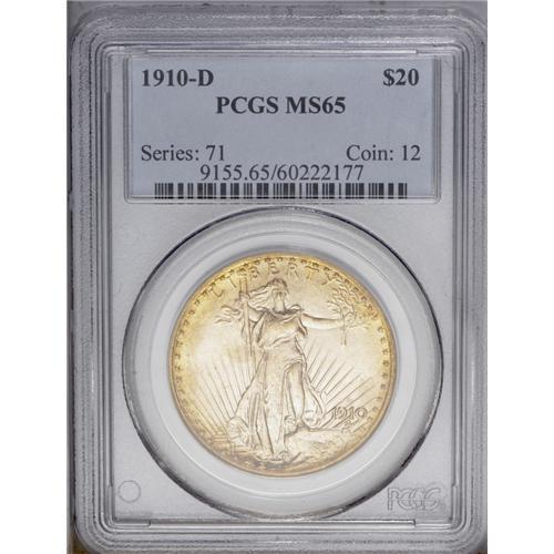 <B>1910-D<$20> MS65 PCGS.</B></I> The most noteworthy attribute of this gorgeous coin is its rich red-gold coloration, which grows steadily deeper near the peripheries. Well struck with amazing luster, the piece has a few scattered blemishes on each side, but they are small enough to go virtually unnoticed. While readily available in grades up to MS64, the 1910-D Saint-Gaudens becomes somewhat less common at or above the Gem level of preservation.