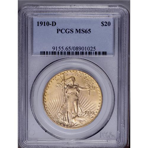 <B>1910-D<$20> MS65 PCGS.</B></I> This is the last year that the Denver Mint used the Wide D mintmark, changing in 1911 and later years to a Narrow D mintmark. Bowers' <I>Guide Book of Double Eagle Gold Coins</B></I> speculates that Narrow D examples may exist for this year. The 1911-D is readily obtainable in the lower Mint State grades, but it becomes difficult as a Gem or higher. This desirable piece shows the typical granular, lustrous surfaces--here colored golden-orange--and a bold strike. A couple of ticks on Liberty's torso are seen under a glass. PCGS has graded 78 examples finer (3/06). <BR><BR><B>Important notice:</B> Heritage usually auctions material at the rate of 200-250 lots per hour. On some occasions eBay Live bid software or the Internet may not be able to keep up with the pace of the auction. We recommend placing a realistic absentee bid now as insurance to avoid disappointment. Occasionally the auctioneer may eliminate or reject an eBay Live bid, and the auctioneer may also reopen a lot after the close of the eBay live bidding (usually because we missed an audience bid), and may reject your bid even if it shows you as the winning bidder. By bidding via eBay Live, you agree that Heritage may award the lot to another bidder at its sole discretion under the circumstances described above or any other reasonable circumstances. Since eBay bids are not shown to us until we open the lot on the floor, we treat those bids just like floor bids. In most cases the floor responds before the eBay bid is presented to us, due to Internet lag time, so for consistency we have made it a policy that floor bids are always considered first over tie eBay live bids. Also please note that all Heritage lots purchased through eBay Live carry a 20% Buyer's Premium. Please make sure you read the Terms and Conditions before you bid. This lot is being auctioned in conjunction with a live floor auction by Heritage Galleries & Auctioneers. All final auction and invoice information will be supplied by Heritage Galleries & Auctioneers, and all other information should be considered preliminary. Lot:4594 <BR><BR><B>Winning Notification and Billing:</B> After the FINAL session in this auction is complete, Heritage will send e-mail and snail mail invoices. This process normally takes several days. All final auction and invoice information will be supplied by Heritage Galleries & Auctioneers, and all other information should be considered preliminary. <BR><BR>This auction will be conducted on a live auction floor and over the Internet through eBay Live. If you choose to place an absentee bid, please take a moment to <font color='#0000ff'><u><a href='http://pages.ebay.com/liveauctions/help/before/laabsentee.html'>learn how eBay Live absentee bidding works</a></u></font><font color='#000000'>
