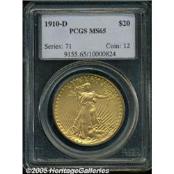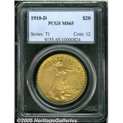 <B>1910-D $20 MS65 PCGS.</B></I> This issue was produced to the extent of 429,000 pieces, and examples are among the scarcest of the branch mint Double Eagles from the early part of this series. While lower grade representatives cannot be called rare, coins that grade as high as the present Gem are another matter entirely. This coin displays typically well struck surfaces for the issue with satiny features and warm golden-orange coloration. There are no overly distracting abrasions on either side.