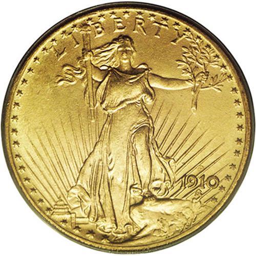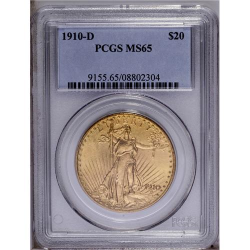 <B>1910-D<$20> MS65 PCGS.</B></I> While one of the more frequently encountered mintmarked twenties from this decade, the 1910-D is scarce in Gem condition and it is certainly unusual to have several MS65 examples in one auction. This is a satiny, pinkish-golden tinged example that is sharply struck, and lacks any significant abrasions. <BR><BR><B>Important notice:</B> Heritage usually auctions material at the rate of 200-250 lots per hour. On some occasions eBay Live bid software or the Internet may not be able to keep up with the pace of the auction. We recommend placing a realistic absentee bid now as insurance to avoid disappointment. Occasionally the auctioneer may eliminate or reject an eBay Live bid, and the auctioneer may also reopen a lot after the close of the eBay live bidding (usually because we missed an audience bid), and may reject your bid even if it shows you as the winning bidder. By bidding via eBay Live, you agree that Heritage may award the lot to another bidder at its sole discretion under the circumstances described above or any other reasonable circumstances. Since eBay bids are not shown to us until we open the lot on the floor, we treat those bids just like floor bids. In most cases the floor responds before the eBay bid is presented to us, due to Internet lag time, so for consistency we have made it a policy that floor bids are always considered first over tie eBay live bids. Also please note that all Heritage lots purchased through eBay Live carry a 20% Buyer's Premium. Please make sure you read the Terms and Conditions before you bid. This lot is being auctioned in conjunction with a live floor auction by Heritage Galleries & Auctioneers. All final auction and invoice information will be supplied by Heritage Galleries & Auctioneers, and all other information should be considered preliminary. Lot:4598 <BR><BR><B>Winning Notification and Billing:</B> After the FINAL session in this auction is complete, Heritage will send e-mail and snail mail invoices. This process normally takes several days. All final auction and invoice information will be supplied by Heritage Galleries & Auctioneers, and all other information should be considered preliminary. <BR><BR>This auction will be conducted on a live auction floor and over the Internet through eBay Live. If you choose to place an absentee bid, please take a moment to <font color='#0000ff'><u><a href='http://pages.ebay.com/liveauctions/help/before/laabsentee.html'>learn how eBay Live absentee bidding works</a></u></font><font color='#000000'>