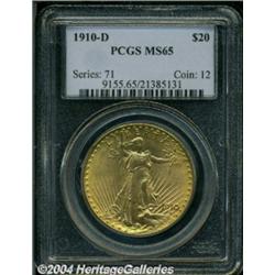 <table><tbody><tr><td><table> <TR><TD width="100%"><TABLE cellSpacing=1 cellPadding=3 width="100%" border=0><TBODY><TR><TD width="100%" bgColor=#79735c><FONT face=arial color=#ffffff size=3><B>Description</B> </FONT></TD></TR><TR><TD width="100%" bgColor=#ffffff><FONT face=arial size=2><B>1910-D $20 MS65 PCGS.</B></I> Impeccable, satiny surfaces are draped in a natural reddish-gold patina that adds even further to the appeal of this conditionally scarce Saint-Gaudens issue. </FONT></TD></TR></TBODY></TABLE></TD></TR></TBODY></TABLE><BR><A name=PricesRealized></A><TABLE cellSpacing=0 cellPadding=0 width="100%" bgColor=#000000 border=0><TBODY><TR><TD width="100%"><TABLE cellSpacing=1 cellPadding=3 width="100%" border=0><TBODY><TR><TD width="100%" bgColor=#79735c><A name=PR><FONT face=arial color=#ffffff size=3><B>Previous Prices from Heritage Auctions</B> </FONT></A></TD></TR><TR><TD bgColor=#f6f6ed><TABLE cellSpacing=0 cellPadding=0 width="100%" border=1><TBODY><TR><TD align=middle width="33%"><B>Date</B></TD><TD align=middle width="33%"><B>Service</B></TD><TD align=middle width="33%"><B>Price</B></TD></TR><TR bgColor=whitesmoke><TD width="33%"><B>08/26/2003</B></TD><TD width="33%">PCGS</TD><TD width="33%">$2,645.00</TD></TR><TR bgColor=whitesmoke><TD width="33%"><B>08/26/2003</B></TD><TD width="33%">PCGS</TD><TD width="33%">$2,645.00</TD></TR><TR bgColor=whitesmoke><TD width="33%"><B>08/19/2003</B></TD><TD width="33%">NGC</TD><TD width="33%">$2,875.00</TD></TR><TR bgColor=whitesmoke><TD width="33%"><B>05/06/2003</B></TD><TD width="33%">NGC</TD><TD width="33%">$2,817.50</TD></TR><TR bgColor=whitesmoke><TD width="33%"><B>05/06/2003</B></TD><TD width="33%">NGC</TD><TD width="33%">$2,817.50</TD></TR><TR bgColor=whitesmoke><TD width="33%"><B>11/05/2002</B></TD><TD width="33%">NGC</TD><TD width="33%">$2,587.50</TD></TR><TR bgColor=whitesmoke><TD width="33%"><B>06/08/2002</B></TD><TD width="33%">PCGS</TD><TD width="33%">$2,300.00</TD></TR><TR bgColor=whitesmoke><TD width="33%"><B>06/08/2002</B></TD><TD width="33%">PCGS</TD><TD width="33%">$2,300.00</TD></TR><TR bgColor=whitesmoke><TD width="33%"><B>06/08/2002</B></TD><TD width="33%">PCGS</TD><TD width="33%">$2,472.50</TD></TR><TR bgColor=whitesmoke><TD width="33%"><B>01/12/2002</B></TD><TD width="33%">PCGS</TD><TD width="33%">$2,300.00</TD></TR><TR bgColor=whitesmoke><TD width="33%"><B>01/12/2002</B></TD><TD width="33%">PCGS</TD><TD width="33%">$2,300.00</TD></TR><TR bgColor=whitesmoke><TD width="33%"><B>05/31/2001</B></TD><TD width="33%">PCGS</TD><TD width="33%">$1,955.00</TD></TR><TR bgColor=whitesmoke><TD width="33%"><B>02/23/2001</B></TD><TD width="33%">NGC</TD><TD width="33%">$1,725.00</TD></TR><TR bgColor=whitesmoke><TD width="33%"><B>02/23/2001</B></TD><TD width="33%">NGC</TD><TD width="33%">$1,725.00</TD></TR><TR bgColor=whitesmoke><TD width="33%"><B>02/23/2001</B></TD><TD width="33%">PCGS</TD><TD width="33%">$1,955.00</TD></TR><TR bgColor=whitesmoke><TD width="33%"><B>02/23/2001</B></TD><TD width="33%">PCGS</TD><TD width="33%">$1,955.00</TD></TR><TR bgColor=whitesmoke><TD width="33%"><B>02/23/2001</B></TD><TD width="33%">PCGS</TD><TD width="33%">$1,955.00</TD></TR><TR bgColor=whitesmoke><TD width="33%"><B>01/07/2000</B></TD><TD width="33%">PCGS</TD><TD width="33%">$2,645.00</TD></TR><TR bgColor=whitesmoke><TD width="33%"><B>09/26/1998</B></TD><TD width="33%">NGC</TD><TD width="33%">$2,875.00</TD></TR><TR bgColor=whitesmoke><TD width="33%"><B>09/26/1998</B></TD><TD width="33%">NGC</TD><TD width="33%">$2,875.00</TD></TR><TR bgColor=whitesmoke><TD width="33%"><B>08/07/1998</B></TD><TD width="33%">NGC</TD><TD width="33%">$2,300.00</TD></TR><TR bgColor=whitesmoke><TD width="33%"><B>08/02/1997</B></TD><TD width="33%">PCGS</TD><TD width="33%">$2,127.50</TD></TR><TR bgColor=whitesmoke><TD width="33%"><B>08/02/1997</B></TD><TD width="33%">PCGS</TD><TD width="33%">$2,127.50</TD></TR><TR bgColor=whitesmoke><TD width="33%"><B>01/06/1996</B></TD><TD width="33%">PCGS</TD><TD width="33%">$1,760.00</TD></TR><TR bgColor=whitesmoke><TD width="33%"><B>08/16/1995</B></TD><TD width="33%">PCGS</TD><TD width="33%">$2,310.00</TD></TR><TR bgColor=whitesmoke><TD width="33%"><B>08/16/1995</B></TD><TD width="33%">PCGS</TD><TD width="33%">$2,310.00</TD></TR><TR bgColor=whitesmoke><TD width="33%"><B>03/04/1995</B></TD><TD width="33%">PCGS</TD><TD width="33%">$2,860.00</TD></TR><TR bgColor=whitesmoke><TD width="33%"><B>05/06/1994</B></TD><TD width="33%">PCGS</TD><TD width="33%">$2,970.00</TD></TR><TR bgColor=whitesmoke><TD width="33%"><B>05/06/1994</B></TD><TD width="33%">PCGS</TD><TD width="33%">$2,970.00</TD></TR><TR bgColor=whitesmoke><TD width="33%"><B>05/01/1990</B></TD><TD width="33%">PCGS</TD><TD width="33%">$4,400.00</TD></TR><TR bgColor=whitesmoke><TD width="33%"><B>06/01/1998</B></TD><TD width="33%">PCGS</TD><TD width="33%">$2,475.00</TD></TR><TR bgColor=whitesmoke><TD width="33%"><B>06/01/1998</B></TD><TD width="33%">PCGS</TD><TD width="33%">$2,475.00</TD></TR><TR bgColor=whitesmoke><TD width="33%"><B>01/01/1995</B></TD><TD width="33%">PCGS</TD><TD width="33%">$2,200.00</TD></TR><TR bgColor=whitesmoke><TD width="33%"><B>03/01/1995</B></TD><TD width="33%">PCGS</TD><TD width="33%">$1,980.00</TD></TR><TR bgColor=whitesmoke><TD width="33%"><B>03/01/1995</B></TD><TD width="33%">PCGS</TD><TD width="33%">$1,980.00</TD></TR><TR bgColor=whitesmoke><TD width="33%"><B>02/01/1991</B></TD><TD width="33%">NGC</TD><TD width="33%">$3,740.00</TD></TR><TR bgColor=whitesmoke><TD width="33%"><B>05/01/1994</B></TD><TD width="33%">NGC</TD><TD width="33%">$2,200.00</TD></TR><TR bgColor=whitesmoke><TD width="33%"><B>05/01/1994</B></TD><TD width="33%">NGC</TD><TD width="33%">$2,200.00</TD></TR><TR bgColor=whitesmoke><TD width="33%"><B>06/01/1997</B></TD><TD width="33%">NGC</TD><TD width="33%">$2,090.00</TD></TR><TR bgColor=whitesmoke><TD width="33%"><B>09/01/1997</B></TD><TD width="33%">NGC</TD><TD width="33%">$2,090.00</TD></TR><TR bgColor=whitesmoke><TD width="33%"><B>09/01/199