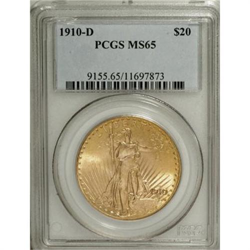 <B>1910-D $20 MS65 PCGS.</B></I> The satiny mint luster has taken on a lovely, even overlay of light reddish patina over both obverse and reverse. A fully struck example and rarely encountered finer.<BR><BR><b>Shipping:</b> Coins & Currency (<a target="_blank" href="http://www.heritageauctions.com/common/shipping.php">view shipping information</a>)