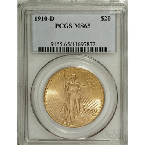 <B>1910-D $20 MS65 PCGS.</B></I> Fully struck, each side is covered with thick, satiny mint luster. Rarely encountered any finer than MS64.<BR><BR><b>Shipping:</b> Coins & Currency (<a target="_blank" href="http://www.heritageauctions.com/common/shipping.php">view shipping information</a>)