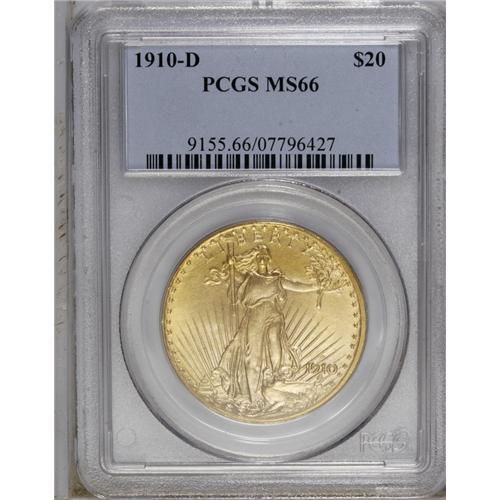 <B>1910-D<$20> MS66 PCGS.</B></I> The 1910-D double eagle is a common date in any condition short of MS65. Even at the Gem level, this issue is only moderately scarce and can be found without undue difficulty. At the MS66 grade tier, however, the 1910-D is quite scarce and not frequently offered at public auction. This coin exhibits beautifully smooth surfaces that are nearly pristine. The striking details are crisp and full throughout, and softly frosted luster glows from each side. PCGS has certified just two finer pieces (9/06).