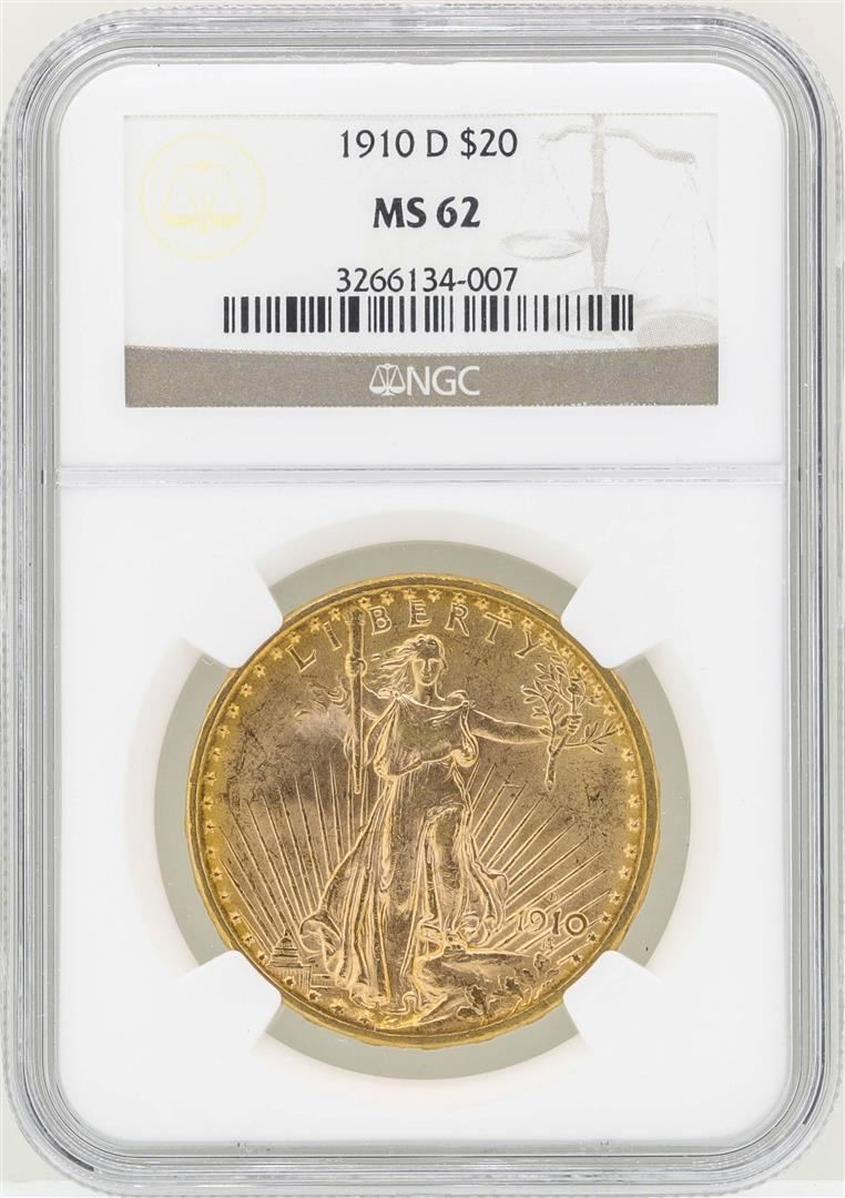 One 1910-D $20 St. Gaudens Double Eagle Gold Coin NGC MS62. NGC Certified.