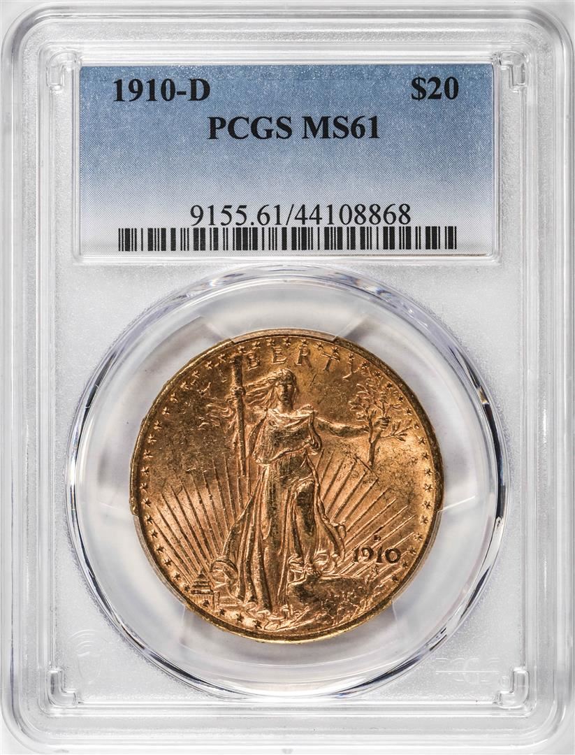 One 1910-D $20 St Gaudens Double Eagle Gold Coin PCGS MS61. PCGS Graded.