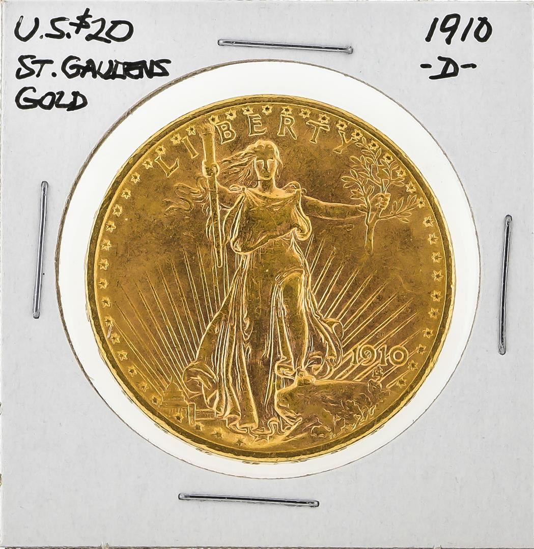 One 1910-D $20 St. Gaudens Double Eagle Gold Coin.