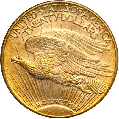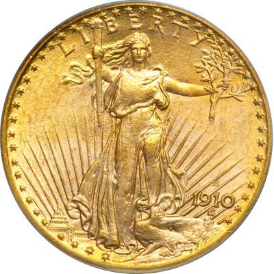 1910-D $20 St. Gaudens. PCGS graded MS-62. Light golden toning. Attractive golden Mint State preservation in the devices and fields (PCGS # 9155).
