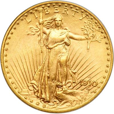 1910-D $20 St. Gaudens. PCGS graded MS-64. Frosty mint surfaces. Color is mostly bright-gold as it shines with iridescence. Few bagmarks can be found. Moreover, devices were struck with energy and full oomph by the dies imparting all design elements boldly (PCGS # 9155) .