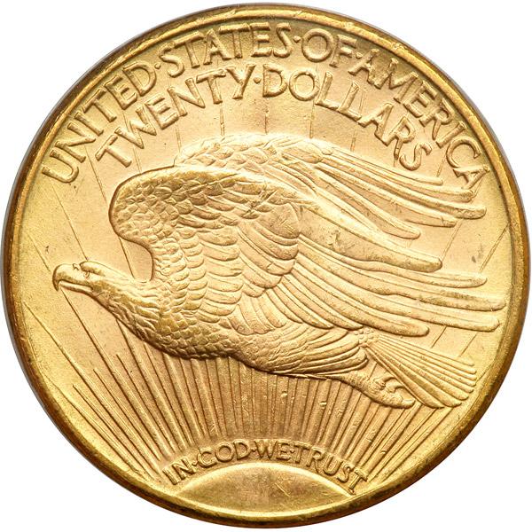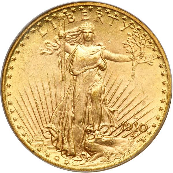 1910-D $20 St. Gaudens. PCGS graded MS-65. Frosty and untoned. A solid Gem BU example of a brilliant tinted gold coin with minimal abrasions or marks. This is a well-struck example with good details, we should add. It has no bothersome tarnish spots or points of wear. Pop 879; 103 finer (PCGS # 9155) .