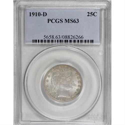 <B>1910-D 25C MS63 PCGS.</B></I> PCGS Population (12/59). NGC Census: (14/39). Mintage: 1,500,000. Numismedia Wsl. Price for NGC/PCGS coin in MS63: $775. (#5658)<BR><BR><B>Coin Engraver:</B> Charles E. Barber<BR><BR><b>Shipping:</b> Coins & Currency (<a target="_blank" href="http://www.heritageauctions.com/common/shipping.php">view shipping information</a>)