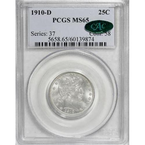 <B>1910-D 25C MS65 PCGS. CAC.</B></I> A bold Gem with frosty silver surfaces and exceptional brilliance. Neither side exhibits any toning. Population: 20 in 65, 11 finer (1/08).<BR><I>From The Southwest Collection.</B></I><BR><BR><B>Coin Engraver:</B> Charles E. Barber<BR><BR><b>Shipping:</b> Coins & Currency (<a target="_blank" href="http://www.heritageauctions.com/common/shipping.php">view shipping information</a>)