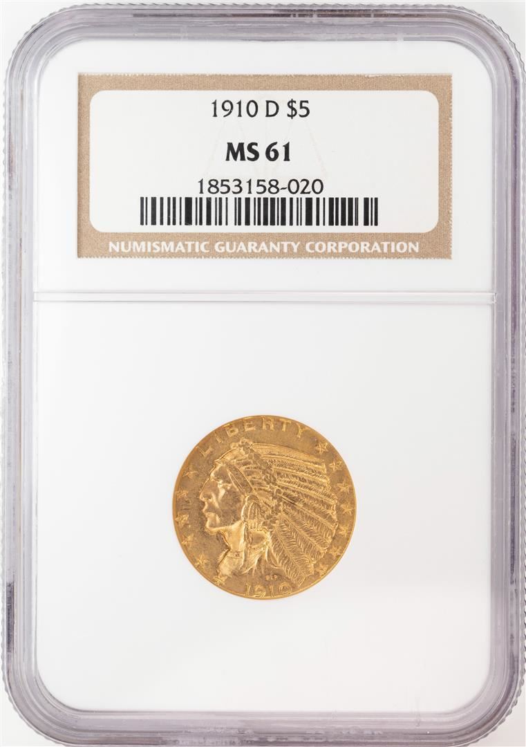 One 1910-D $5 Indian Head Half Eagle Gold Coin NGC MS61. NGC Certified.