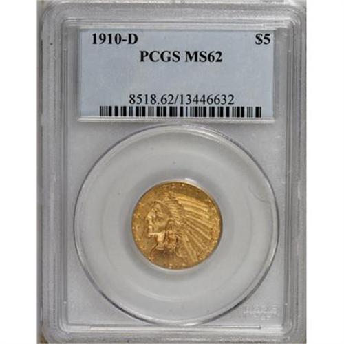 <B>1910-D $5 MS62 PCGS.</B></I> The heavy production of 1909-D half eagles led to a surfeit of the coins, and in 1910, Denver struck only 193,600 examples of that denomination. This lustrous and well-defined example, wheat-gold with elements of orange, has scattered abrasions that account for the grade.<BR><BR><B>Coin Engraver:</B> Bela Lyon Pratt<BR><BR><b>Shipping:</b> Coins & Currency (<a target="_blank" href="http://www.heritageauctions.com/common/shipping.php">view shipping information</a>)