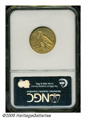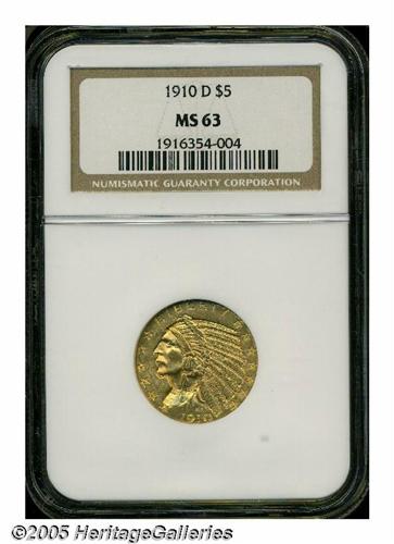 <B>1910-D<$5> MS63 NGC.</B></I> Although this is not considered a rare date, or even a scarce date in the context of Indian Half Eagles, few finer examples have been certified. The surfaces are lightly abraded, but display full, unbroken luster. The outlined mintmark is filled at the center.