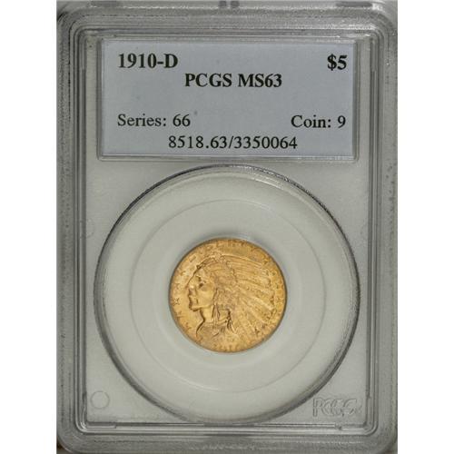 <B>1910-D $5 MS63 PCGS.</B></I> This sharply struck specimen exhibits orange-gold luster evenly distributed over both sides. The obverse has one barely noticeable mark on the cheek while the reverse has minimum abrasions.<BR><I>From The Dr. Eugene Cherny Collection of $5 and $10 Indians.</B></I><BR><BR><b>Shipping:</b> Coin/Currency (<a target="_blank" href="http://www.heritageauctions.com/common/shipping.php">view shipping information</a>) <BR><BR><B>Importan