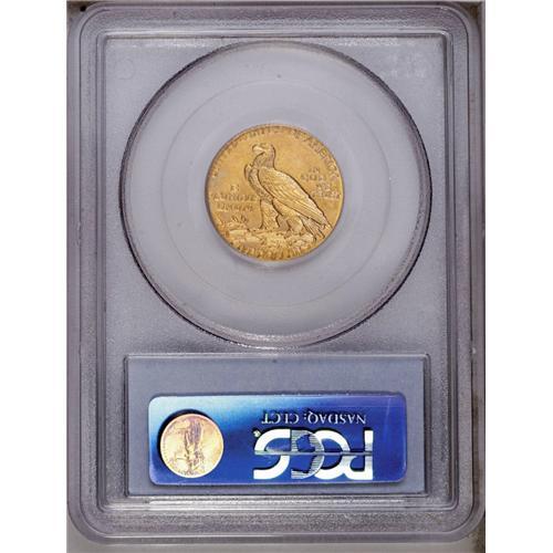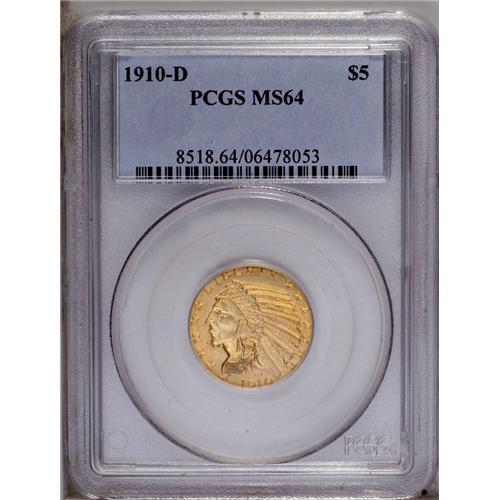 <B>1910-D<$5> MS64 PCGS.</B></I> After the enormous coinage for the 1909-D in excess of 3 million pieces, the following year's Denver Mint emission dwindled to a measly 193,600 examples. Pieces such as the present example that approach a Gem designation are understandably scarce, as few collectors bothered to set aside a specimen of a coin that was unpopular at the time anyway. The present example has lustrous yellow-gold surfaces, a bold mintmark, and only a few minor scrapes in the left obverse (facing) field before the Indian's face. Choice for the grade. Population: 31 in 64, 10 finer (3/06). <BR><BR><B>Important notice:</B> Heritage usually auctions material at the rate of 200-250 lots per hour. On some occasions eBay Live bid software or the Internet may not be able to keep up with the pace of the auction. We recommend placing a realistic absentee bid now as insurance to avoid disappointment. Occasionally the auctioneer may eliminate or reject an eBay Live bid, and the auctioneer may also reopen a lot after the close of the eBay live bidding (usually because we missed an audience bid), and may reject your bid even if it shows you as the winning bidder. By bidding via eBay Live, you agree that Heritage may award the lot to another bidder at its sole discretion under the circumstances described above or any other reasonable circumstances. Since eBay bids are not shown to us until we open the lot on the floor, we treat those bids just like floor bids. In most cases the floor responds before the eBay bid is presented to us, due to Internet lag time, so for consistency we have made it a policy that floor bids are always considered first over tie eBay live bids. Also please note that all Heritage lots purchased through eBay Live carry a 20% Buyer's Premium. Please make sure you read the Terms and Conditions before you bid. This lot is being auctioned in conjunction with a live floor auction by Heritage Galleries & Auctioneers. All final auction and invoice information will be supplied by Heritage Galleries & Auctioneers, and all other information should be considered preliminary. Lot:2888 <BR><BR><B>Winning Notification and Billing:</B> After the FINAL session in this auction is complete, Heritage will send e-mail and snail mail invoices. This process normally takes several days. All final auction and invoice information will be supplied by Heritage Galleries & Auctioneers, and all other information should be considered preliminary. <BR><BR>This auction will be conducted on a live auction floor and over the Internet through eBay Live. If you choose to place an absentee bid, please take a moment to <font color='#0000ff'><u><a href='http://pages.ebay.com/liveauctions/help/before/laabsentee.html'>learn how eBay Live absentee bidding works</a></u></font><font color='#000000'>