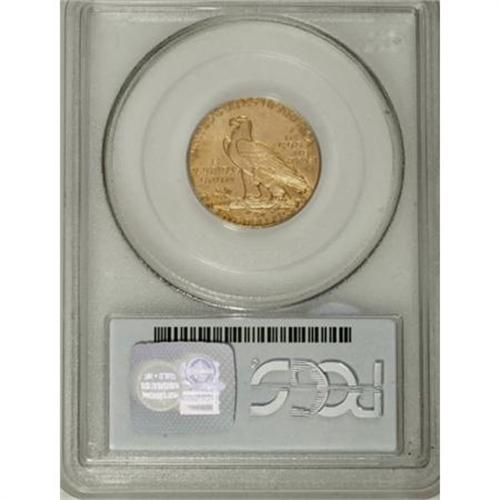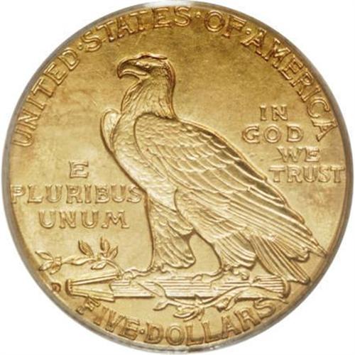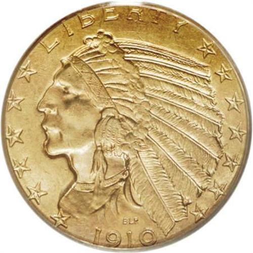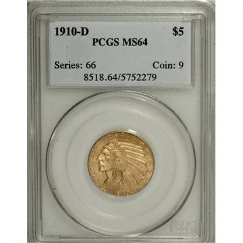 <B>1910-D $5 MS64 PCGS.</B></I> Peach and olive-gold patina confirms the originality of this satiny and impressively unabraded near-Gem. The strike is intricate, especially on the headdress feathers and the eagle's branch. In the MS64 grade, the 1910-D trades for about twice the price of the 1909-D, but is approximately 100 times scarcer. Population: 26 in 64, 10 finer (6/07).<BR><BR><B>Coin Engraver:</B> Bela Lyon Pratt<BR><BR><b>Shipping:</b> Coins & Currency (<a target="_blank" href="http://www.heritageauctions.com/common/shipping.php">view shipping information</a>\)