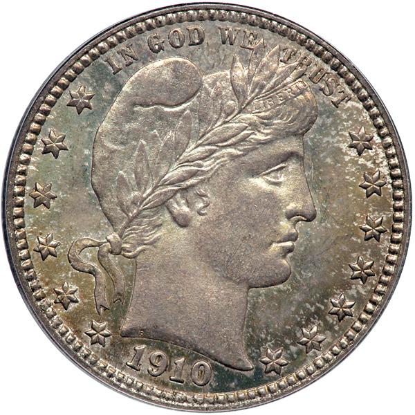 1910-D Barber Quarter Dollar. PCGS graded MS-64 PQ. A beautiful frosty mint example with lovely, slightly iridescent, light toning. Accompanied by an NGC MS-65 tag (PCGS # 5658) .