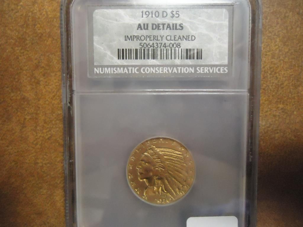 1910-D GOLD US $5 INDIAN NCS AU DETAILS