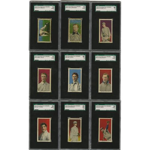 <B>1910 E96 Philadelphia Caramel Partial Set (15/30).</B></I> This 30 card set was issued by Philadelphia Caramel in 1910 as a continuation of their 1909 E95 issue of 25 cards. The set included eight Hall of Famers and this partial set offering includes seven of those eight: Graded cards - <B>SGC 60 EX 5:</B></I> 1 card, Brown. <B>SGC 50 VG-EX 4:</B></I> 1 card, Ames. <B>SGC 40 VG 3:</B></I> 4 cards w/ Clark, Dooin. Konetchy, Meyers. <B>SGC 30 GOOD 2:</B></I> 1 card, Thomas. <B>SGC 20 FAIR 1.5:</B></I> 4 cards w/ Mack, Mowrey, Lajoie, Tinker. <B>SGC 10 POOR 1:</B></I> 4 cards w/ Davis, Delehanty, Herzog, Jennings.<BR><BR><b>Shipping:</b> Trading Card Set, Medium (<a target="_blank" href="http://www.heritageauctions.com/common/shipping.php">view shipping information</a>)
